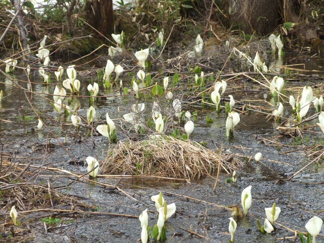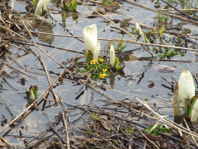 水芭蕉の白とリュウキンカの黄色が絵になります。
