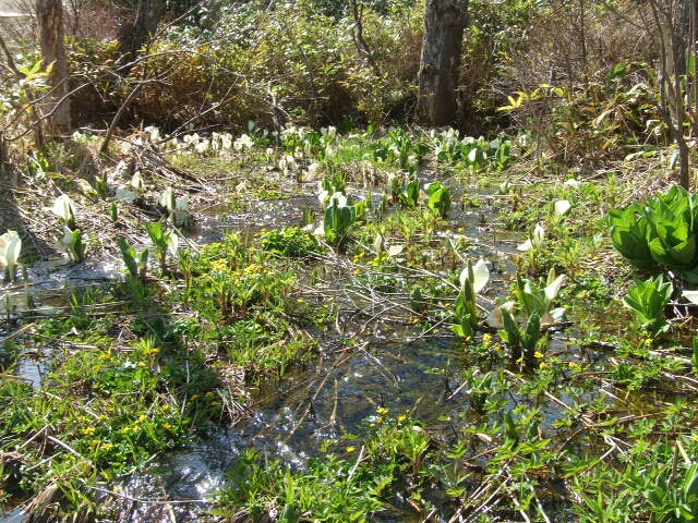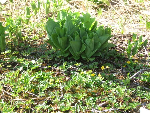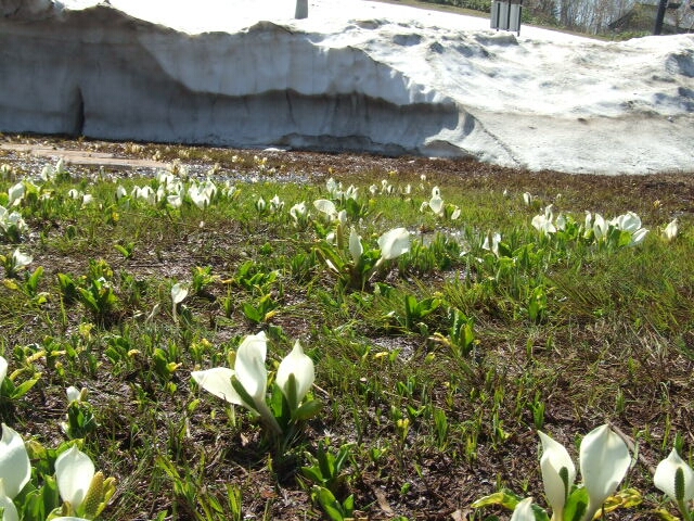 残雪と水芭蕉 まだ2メートル位残雪が残っている場所もあります。 水芭蕉とリュウキンカ 水芭蕉はあまり成長していませんが黄色いリュウキンカの花は増えました。 コ・バイケイソウ コ・バイケイソウも大きくなりました。 毎年は花を付けません。 6月寒い年の方が花を咲かせます。